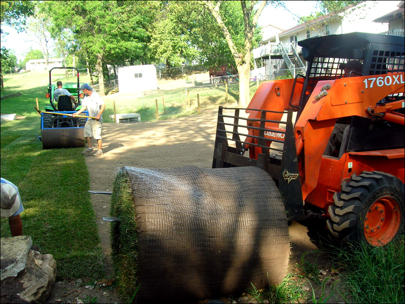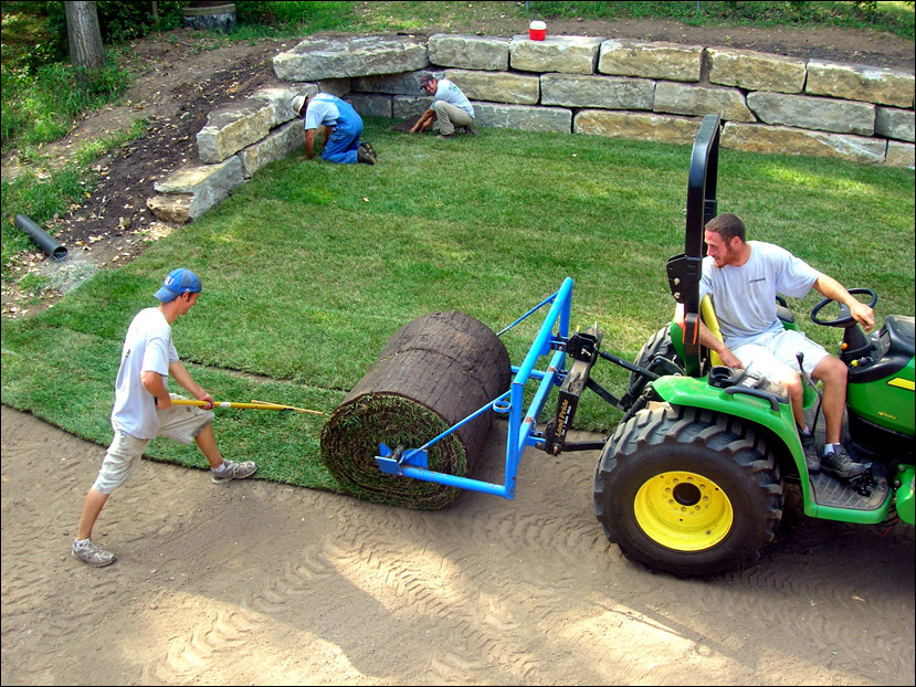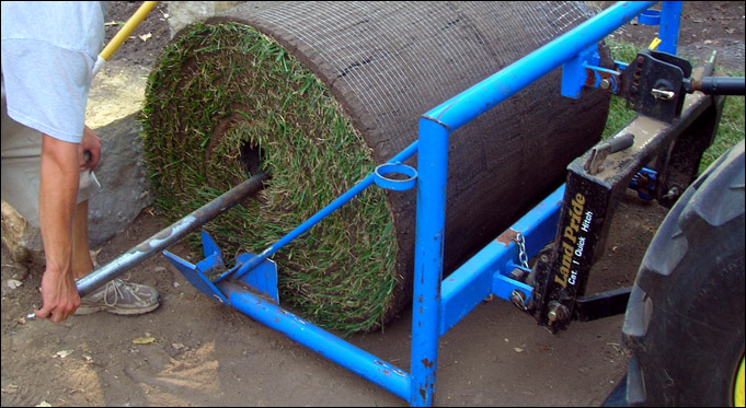 4. The Turf Sod arrives in bales and is installed by a tractor roller. The weight of a new sod bale is an average of 1,200 pounds; this weight removes any air pockets between the sod and the ground, which enables quicker and more effective root penetration. Also, by using large bales vs. small hand rolls of sod, there are fewer seems and more uniformity in yard coverage.